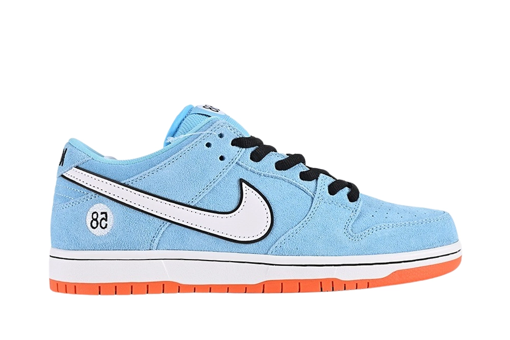 The design of Dunk Low Pro “Club 58 Gulf” is inspired by the Gulf Racing Team. This time, SB and WE CLUB 58 join hands again to present a new Dunk. The upper is made of blue suede, with black laces, a white midsole, and an orange outsole. The side logo of the shoe is outlined with a white and black two-color Swoosh. The tongue label and heel are embellished with “58” logos.