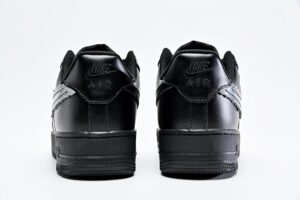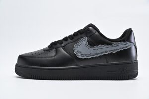 In celebration of the 10th anniversary of Dover Street Market New York, KAWS teamed up with Sky High Farm Workwear to release the Nike Air Force 1 ‘Black.’ The classic silhouette features a blacked-out leather upper with a reimagined cloudy Swoosh, die-cut, appliqued and designed by KAWS. A matching black finish is applied to the rubber midsole, which houses an Air-sole heel unit encapsulated in a lightweight polyurethane wedge.